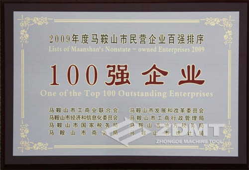由市工商聯、市發改委、經信委、工商局、國稅局、地稅局、商務局、統計局共同組織開展的馬鞍山市2009年度民營企業百強排序活動揭曉。中德機床公司榜上有名,分列“2009年度馬鞍山市民營企業營業收入100強”第70位、“2009年度馬鞍山市民營企業納稅總額100強”第87位。